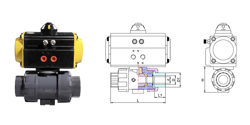 • Pneumatic Plastic 2-Way Double Union Ball Valve made from UPVC offers strong corrosion and chemical resistance in acid, alkali, and saline conditions.