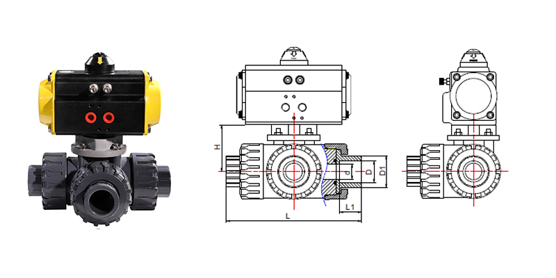 • Pneumatic Plastic 3-Way Double Union Ball Valve provides accurate flow diversion or mixing in automated piping systems.